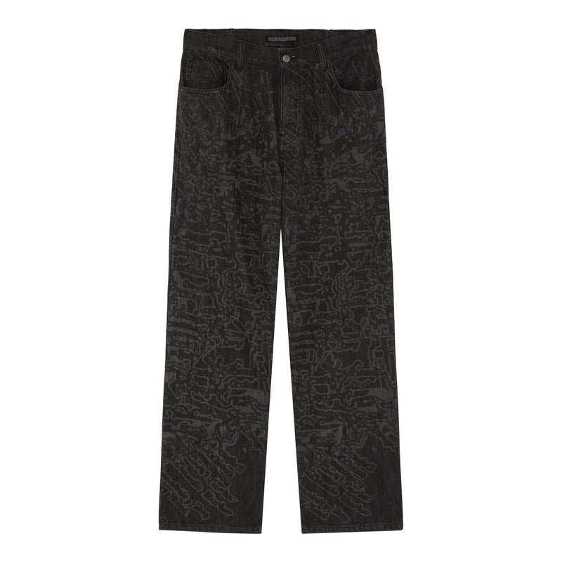Black denim jeans with laser etched map pattern and signature Eire buttons.