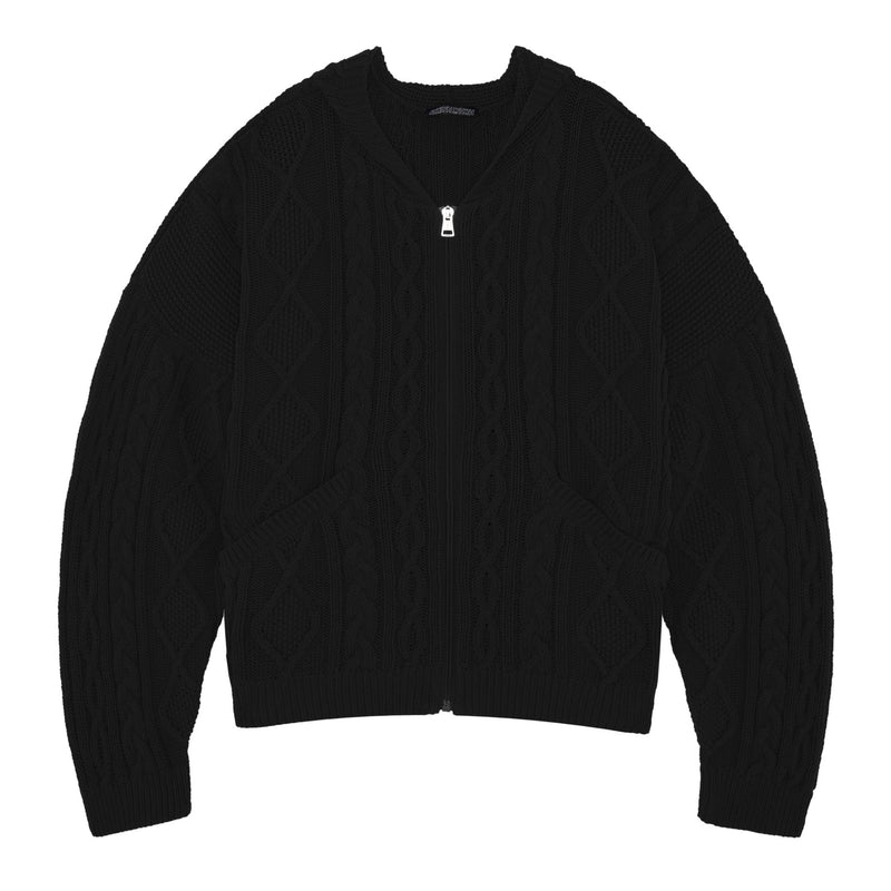 Black cotton oversized cable knit zip up cardigan with hood and pockets.