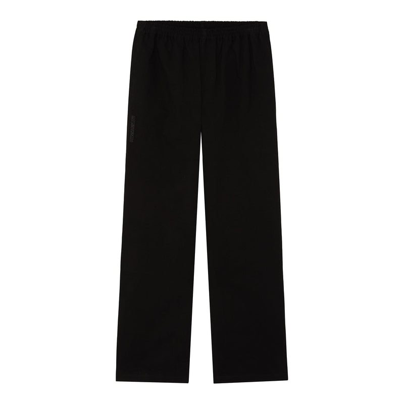Matte black cotton twill trousers with elasticated waistband, back pocket and reflective embroidery logo.
