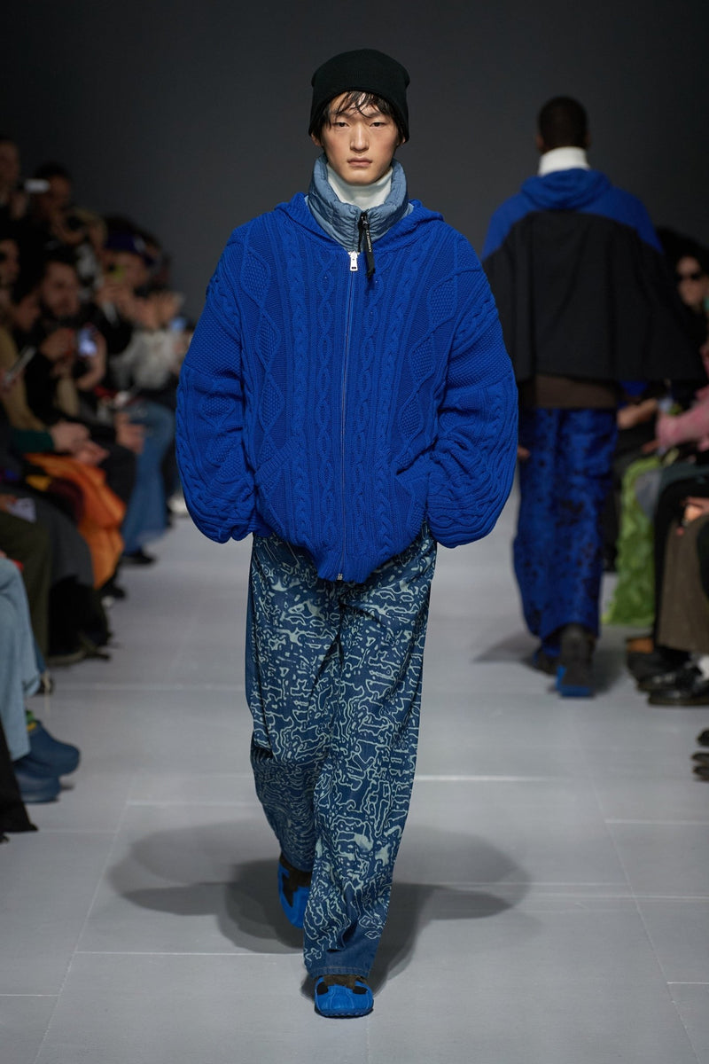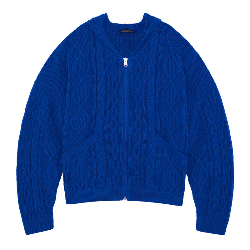 Blue cotton oversized cable knit zip up cardigan with hood and pockets.