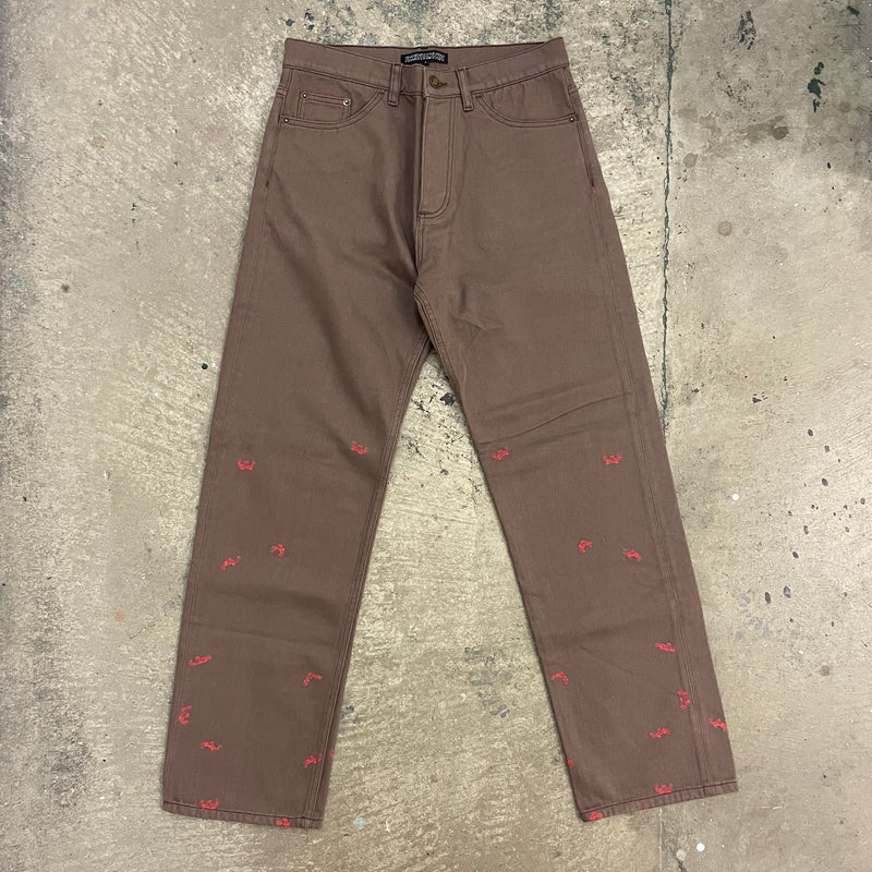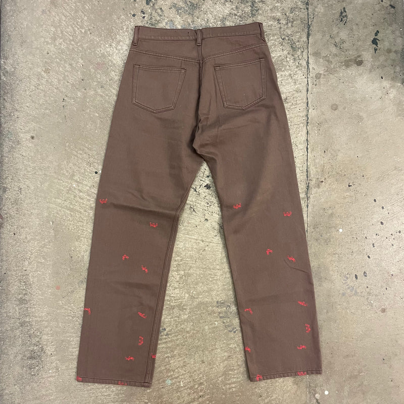 Straight leg brown denim jeans embroidered with red holiday crab print, with signature Eire motif buttons.