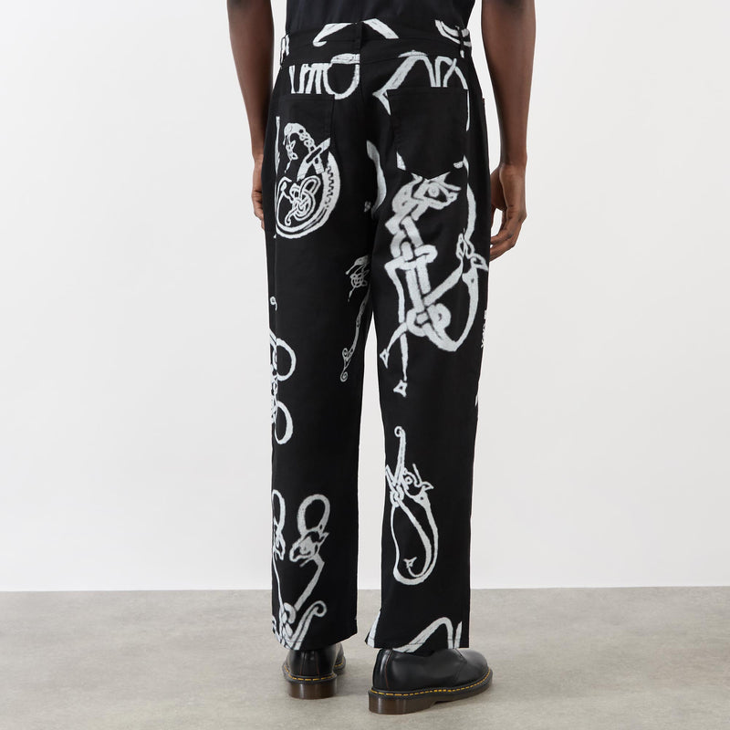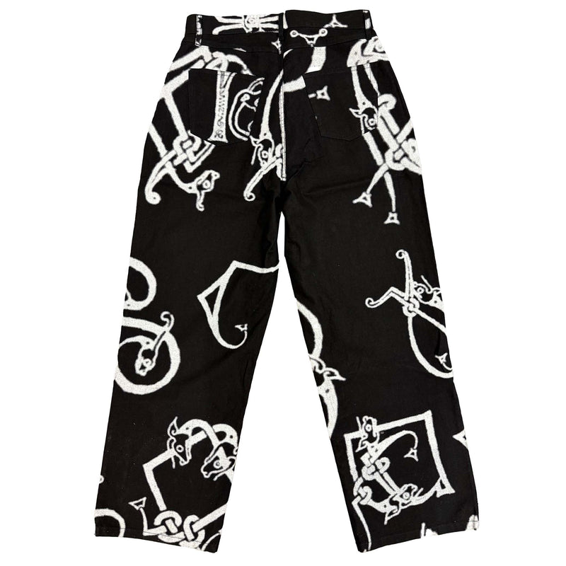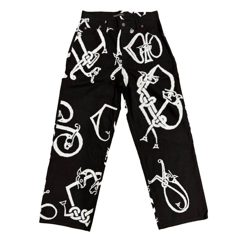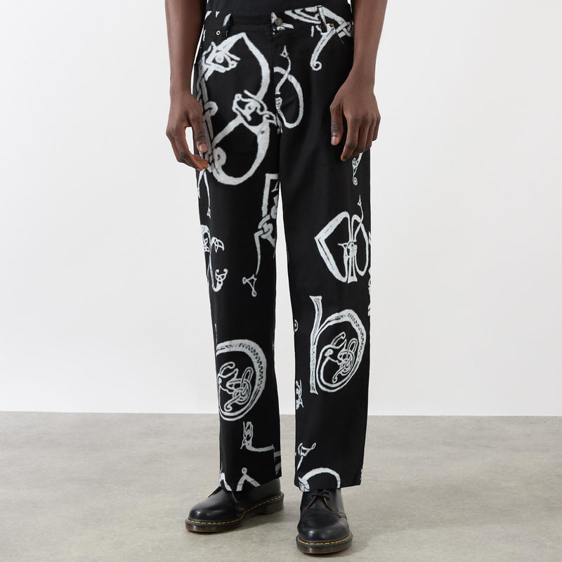 Screen printed loose fit jean. Linen cotton blend, lightweight feel.