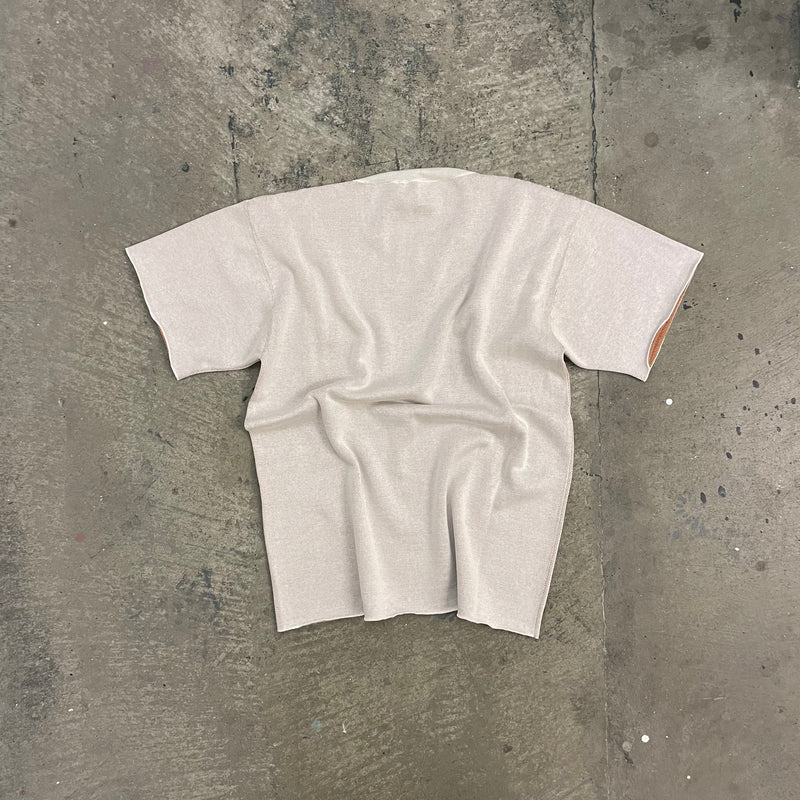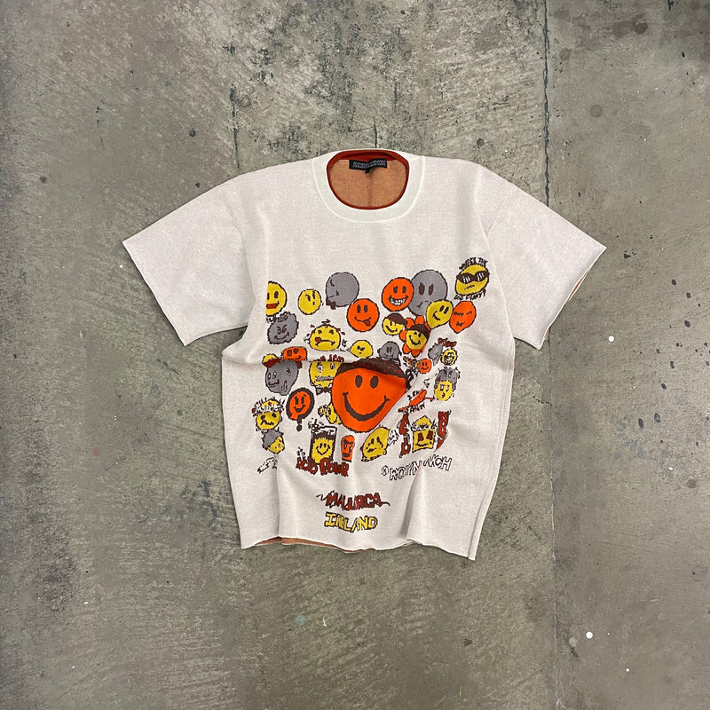 Italian organic cotton yarn knitted T-shirt with holiday smiley print and double neck detail.